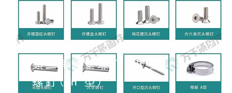 外扳擰:六角、六角法蘭面、六角凸緣、六角花形等;內扳擰:一字槽、十字槽H型、十字槽Z型、十字槽F型、四方槽、復合槽、內花鍵、內六角花形、內三角、內六角、內12角、離合器槽、六葉片型槽、高扭矩十字槽等。3、 PH=phillips 十字槽 sw/fw=split washer/flatwasher 彈墊 平墊 kep nut 鎖緊螺母 cementation 滲碳 acorn nut 蓋形螺母 螺絲頭型 Pan 圓頭(盤頭) Oval 半沉頭 H.W.H.. 六角小法蘭 H.W.F. 六角大法蘭 CSK 沙拉頭(沉頭) La